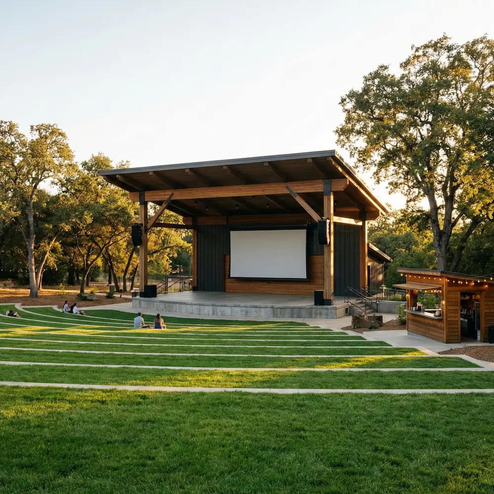 An open-air amphitheater in the town park with lawn seating and a covered stage, ideal for community performances and summer comedy nights.